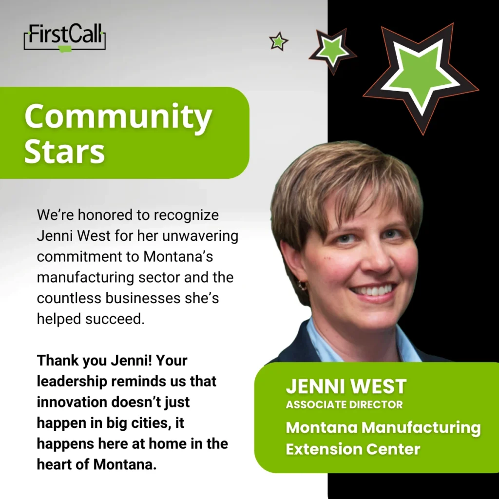 This month, we’re celebrating Jenni West, Associate Director at the Montana Manufacturing Extension Center (MMEC). For more than two decades, Jenni has helped local manufacturers innovate, strengthen their teams, and build sustainable success right here in Montana.